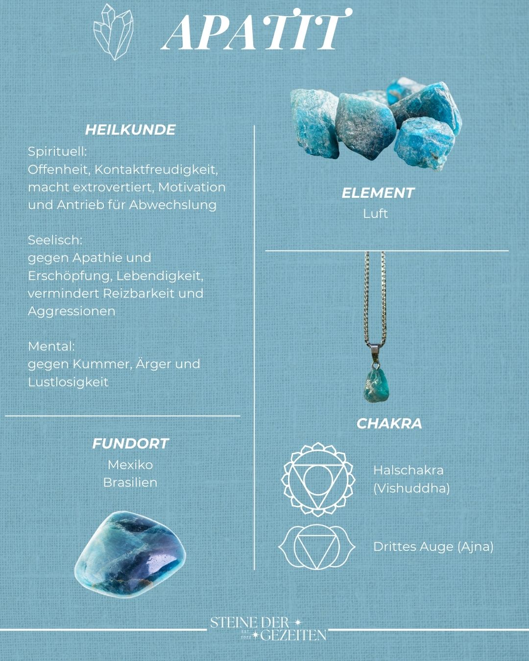 Apatit wird oft als "Stein der Manifestation" bezeichnet. Er ist bekannt dafür, die persönlichen Ambitionen und Wünsche zu fördern und dem Träger dabei zu helfen, seine Ziele zu erreichen. In der spirituellen Praxis wird Apatit als Stein der Inspiration und Motivation angesehen. Er soll die Kreativität anregen, das Selbstbewusstsein stärken und den geistigen Ausdruck fördern.
