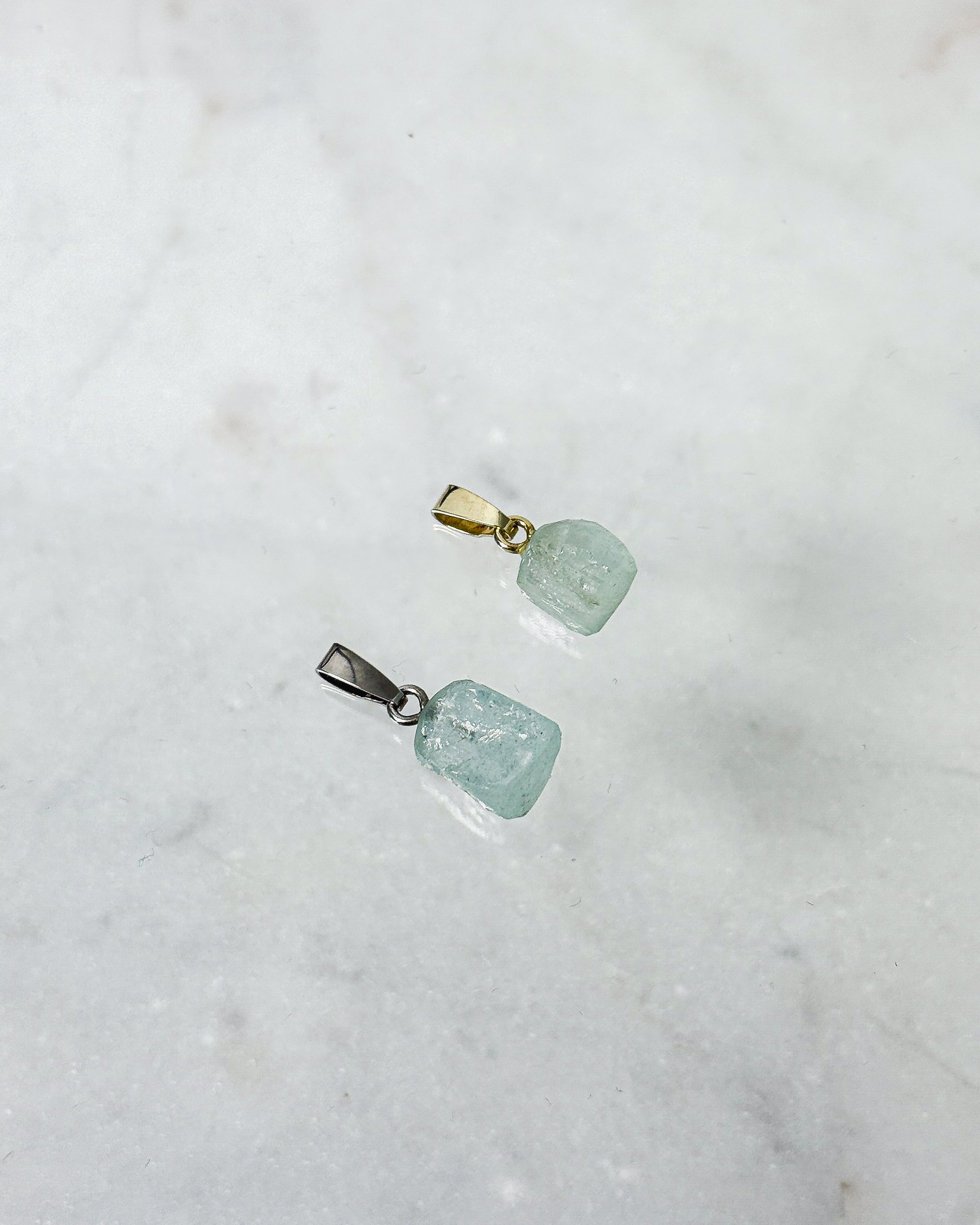 Jeder Aquamarin-Anhänger ist ein handverlesenes Unikat. Die zarte Transparenz des Steins und seine feine Struktur verleihen ihm eine elegante, edle Ausstrahlung. Mit einer Länge von etwa 25–35 mm liegt der Anhänger angenehm auf der Haut. Wähle zwischen einer Öse aus 925er Sterlingsilber oder 14 Karat vergoldet – passend zu deinem Stil.