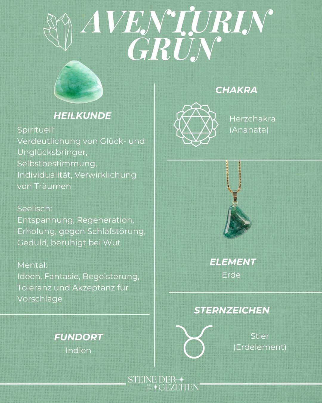 Der Grüne Aventurin Trommelstein ist ein harmonischer Edelstein, der durch seine sanften, grünen Farbtöne und seine beruhigende, glücksbringende Energie besticht. Bei „Steine der Gezeiten“ bieten wir diesen besonderen Trommelstein an, der für seine Fähigkeit bekannt ist, Glück anzuziehen, Wohlstand zu fördern und emotionale Balance zu schaffen. Der Grüne Aventurin Trommelstein ist nicht nur ein ästhetisches Naturprodukt, sondern auch ein wertvoller Begleiter für alle, die in ihrem Leben nach mehr Harmonie, Erfolg und innerem Frieden suchen.