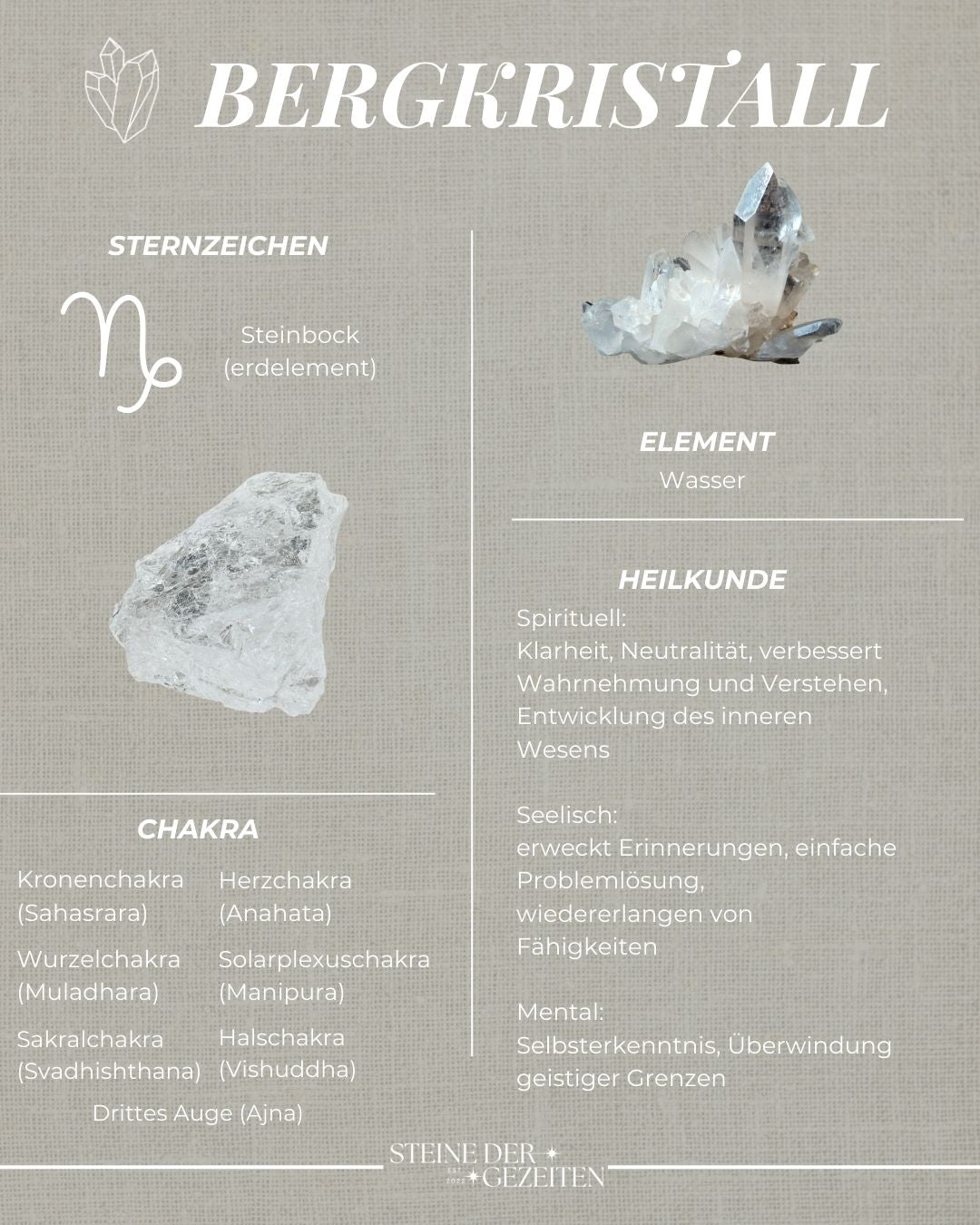 Der Bergkristall ist auch ein mächtiger Verstärker von Energie und Absichten. Er kann die Wirkung anderer Steine verstärken und ist daher ein wertvolles Werkzeug in der Meditation, Heilung und Manifestation. Darüber hinaus steht Bergkristall für Reinheit, sowohl auf physischer als auch auf spiritueller Ebene, und wird oft verwendet, um den Geist zu klären, die Aura zu reinigen und spirituelle Einsichten zu vertiefen.