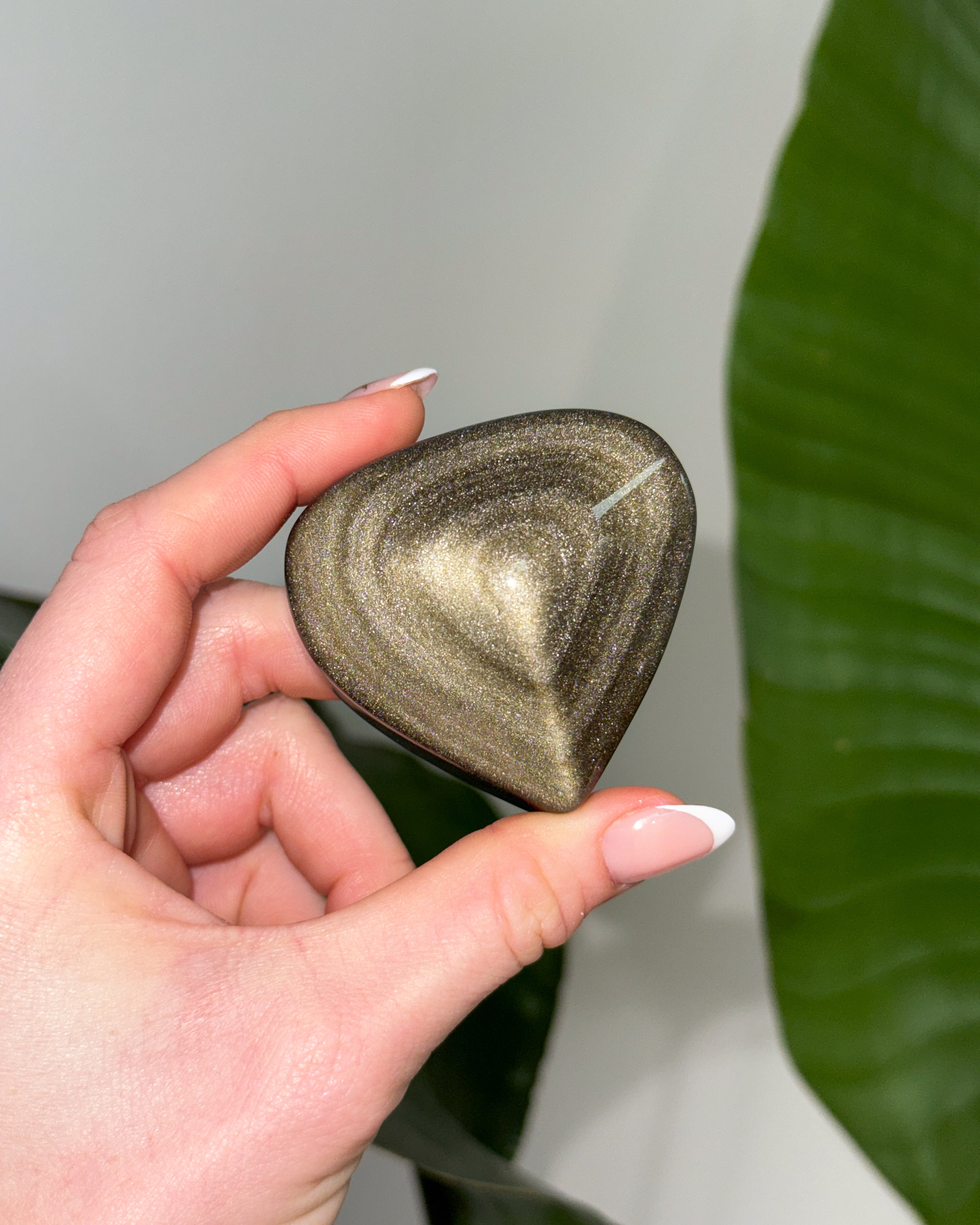 Goldobsidian beeindruckt durch seine tiefschwarze Farbe mit schimmernden, goldenen Reflexen. Er gilt als kraftvoller Schutzstein, der dabei hilft, verborgene Themen zu erkennen und innere Klarheit zu gewinnen.