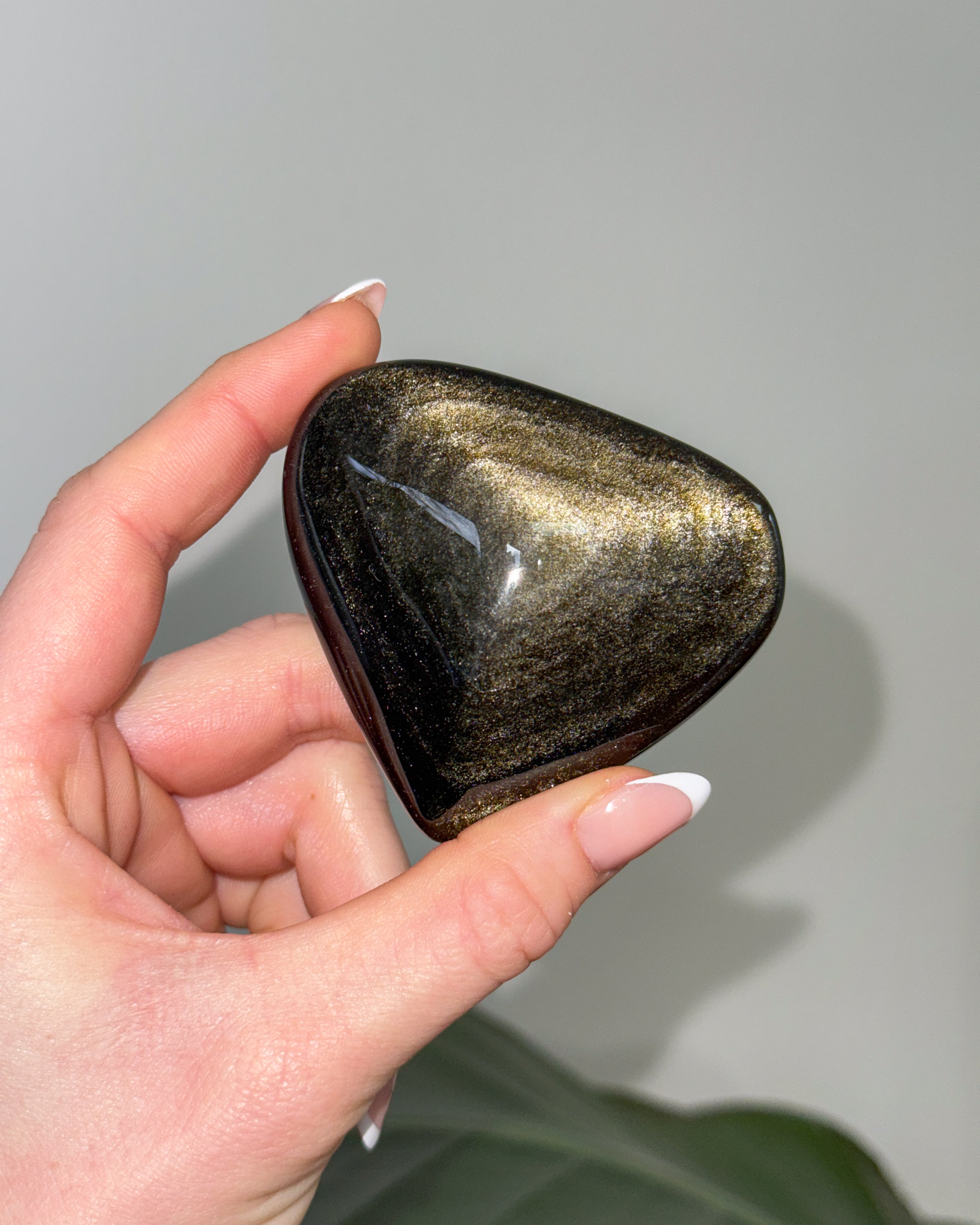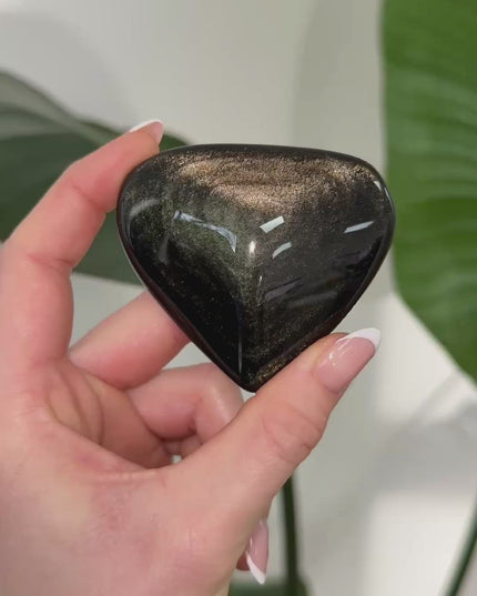 Goldobsidian beeindruckt durch seine tiefschwarze Farbe mit schimmernden, goldenen Reflexen. Er gilt als kraftvoller Schutzstein, der dabei hilft, verborgene Themen zu erkennen und innere Klarheit zu gewinnen.