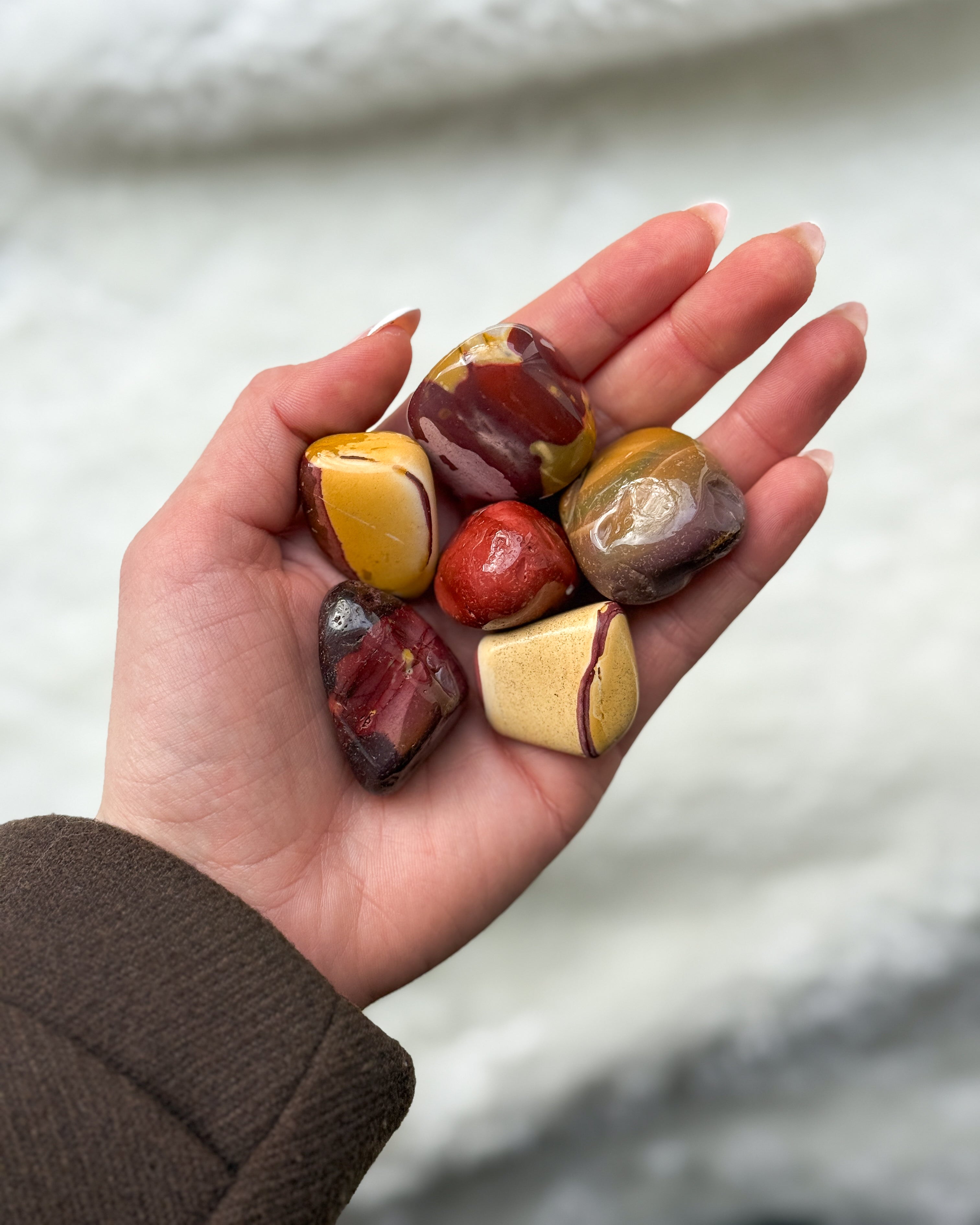 Mookait-Trommelsteine (ca. 3–4 cm) begeistern durch ihre warmen, natürlichen Farbtöne – von Creme über Ocker bis hin zu tiefem Rotbraun. Jeder Stein ist ein Unikat mit lebendigem Muster, glatter Oberfläche und einer angenehmen, handschmeichelnden Form. Mookait zählt zu den farblich vielfältigsten Jaspisarten und wirkt durch seine erdigen Nuancen besonders harmonisch und vital.