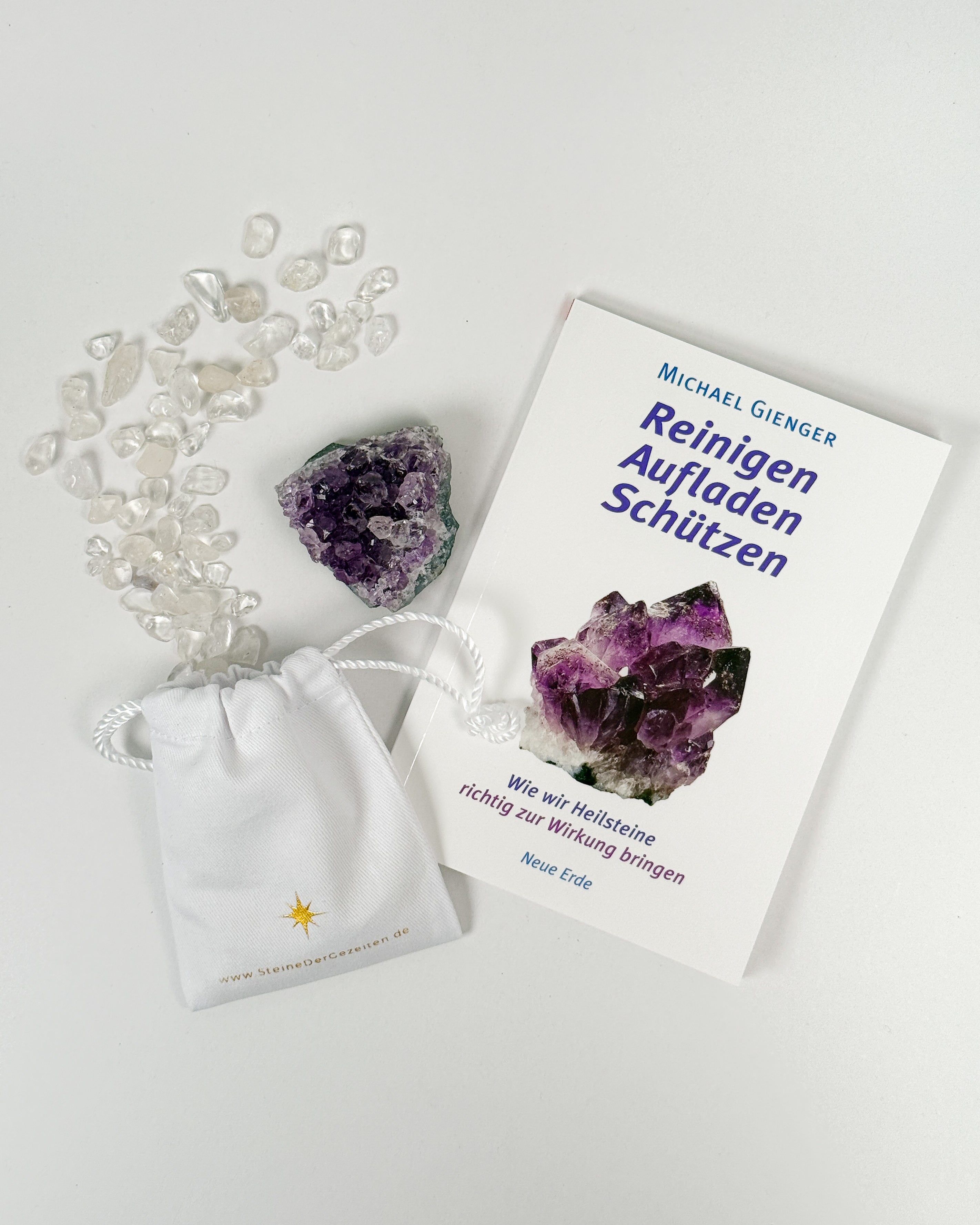 Mit diesem Set reinigst und aktivierst du deine Edelsteine sanft und wirkungsvoll. Enthalten sind eine Amethyst-Druse, Bergkristall-Chips sowie das Standardwerk „Reinigen, Aufladen, Schützen“ von Michael Gienger – alles, was du für die optimale Pflege deiner Steine brauchst.