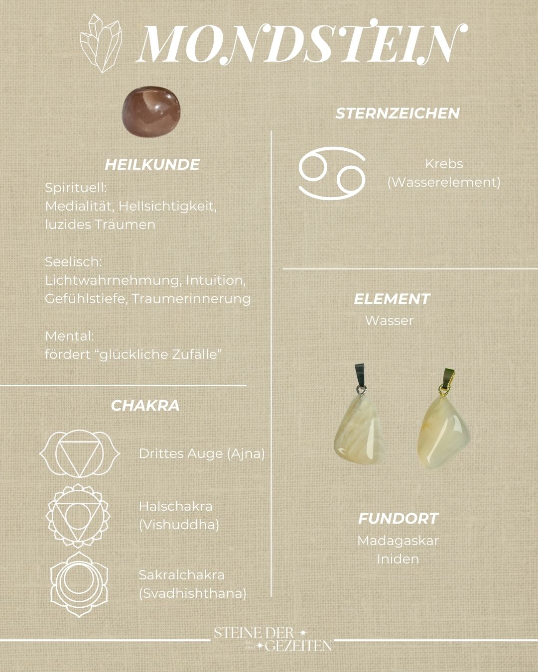 Mondstein ist ein Edelstein, der spirituell Medialität und Hellsichtigkeit steigert und insbesondere luzides Träumen fördert, besonders während des Vollmonds.