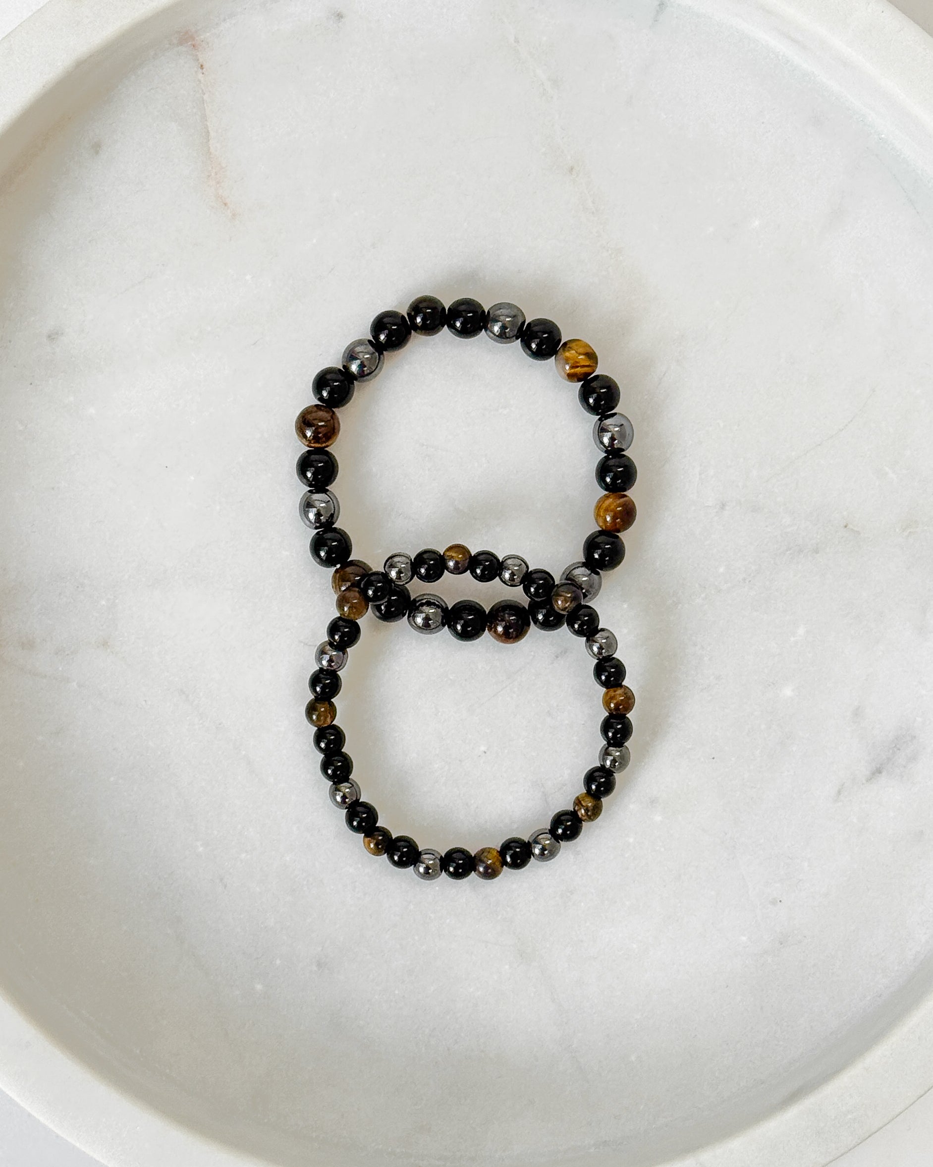 Dieses kraftvolle Perlenarmband vereint die Energie von Hämatit, Obsidian und Tigerauge – drei Steine, die für Schutz, innere Stärke und mentale Klarheit stehen.